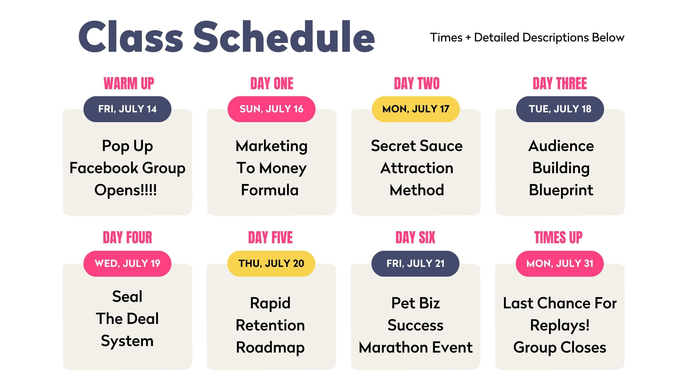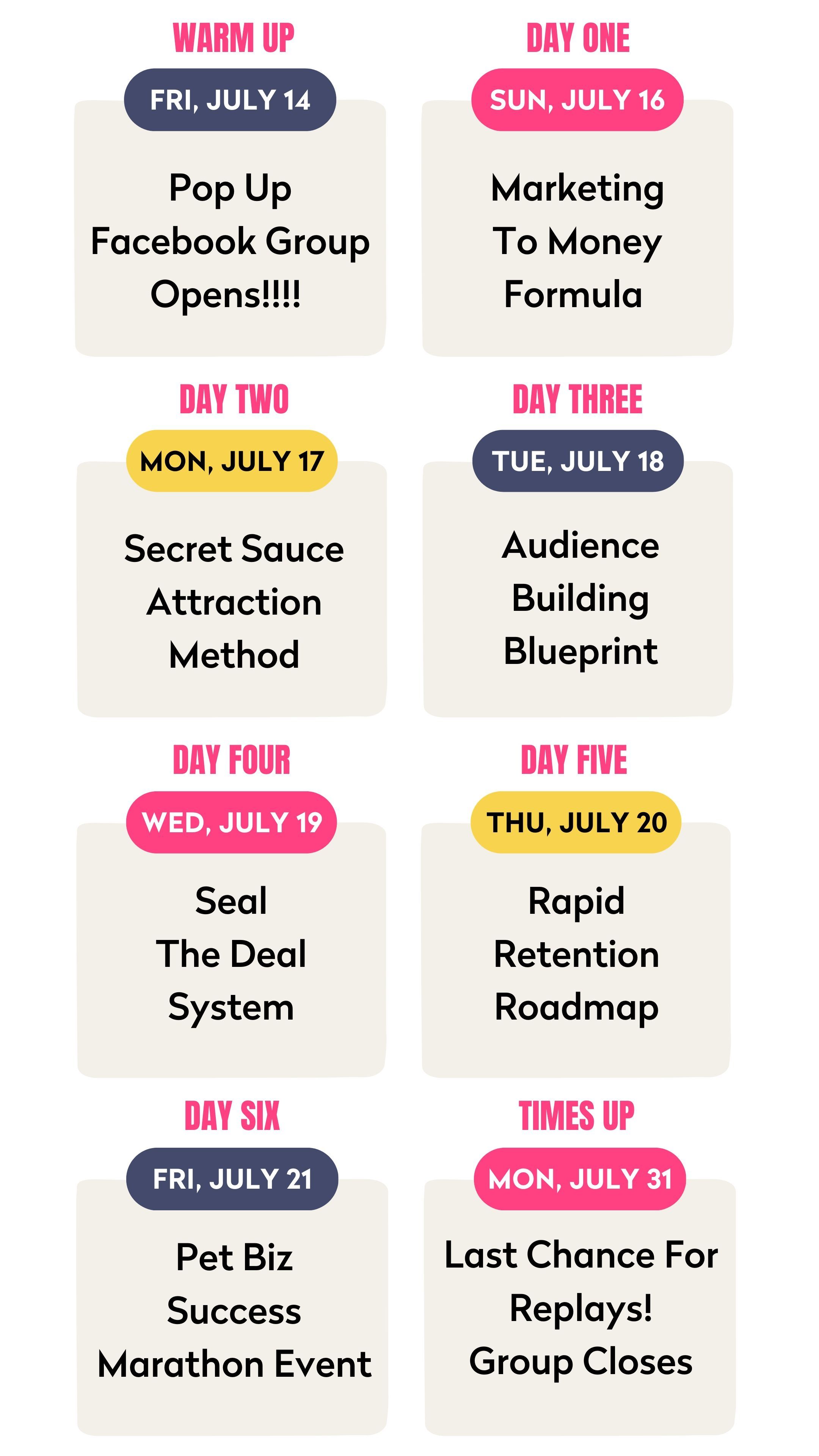 Pet Business Bootcamp is a live, virtual week of workshops, teaching you proven marketing strategies. Our first training session kicks off Sunday, July 16th at 7:00 PM Eastern!